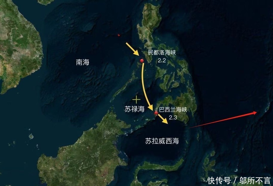 大家注意啊,这里的巴西兰海峡,不是在巴西,而是在菲律宾附近海域,中方舰队从吕宋岛和巴拉望群岛中间的民都洛海峡驶入苏禄海,巴西兰海峡是苏禄海的东南部出口,位于棉兰老岛的最西侧。